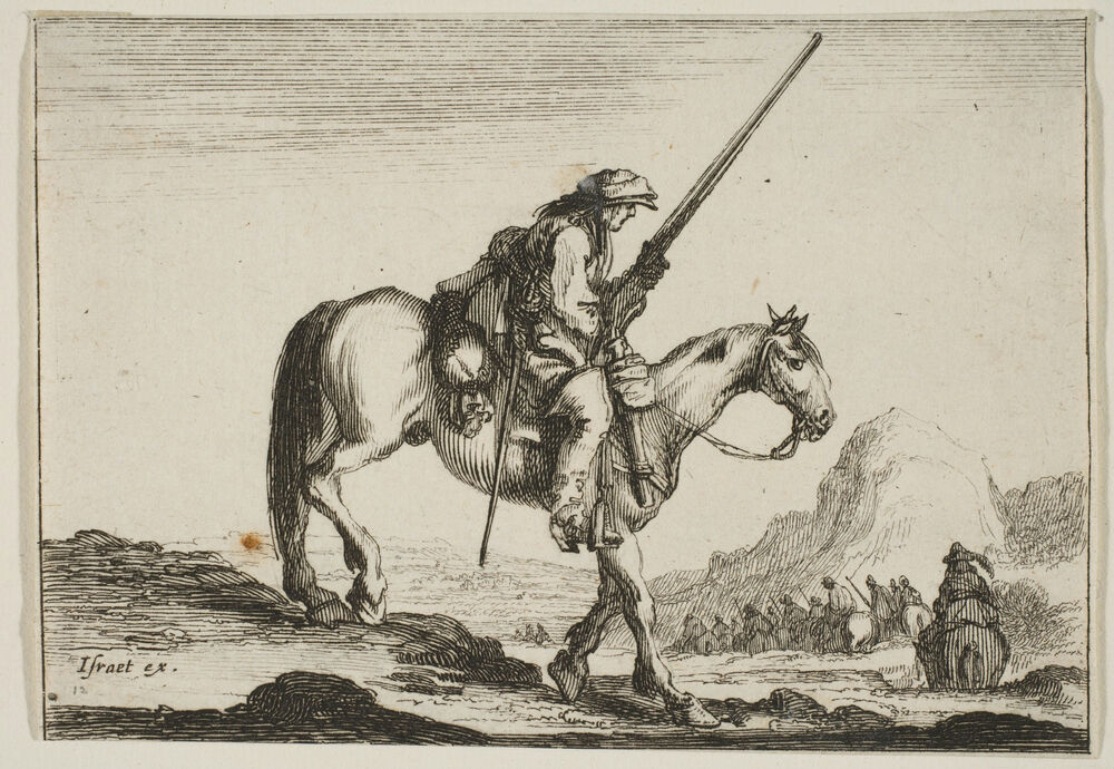 Plate 12: A soldier on horseback, holding a musket in his right hand, in profile descending a slope towards the right, other soldiers on horseback to right in the background, from 'Various Figures' (Agréable diversité de figures)