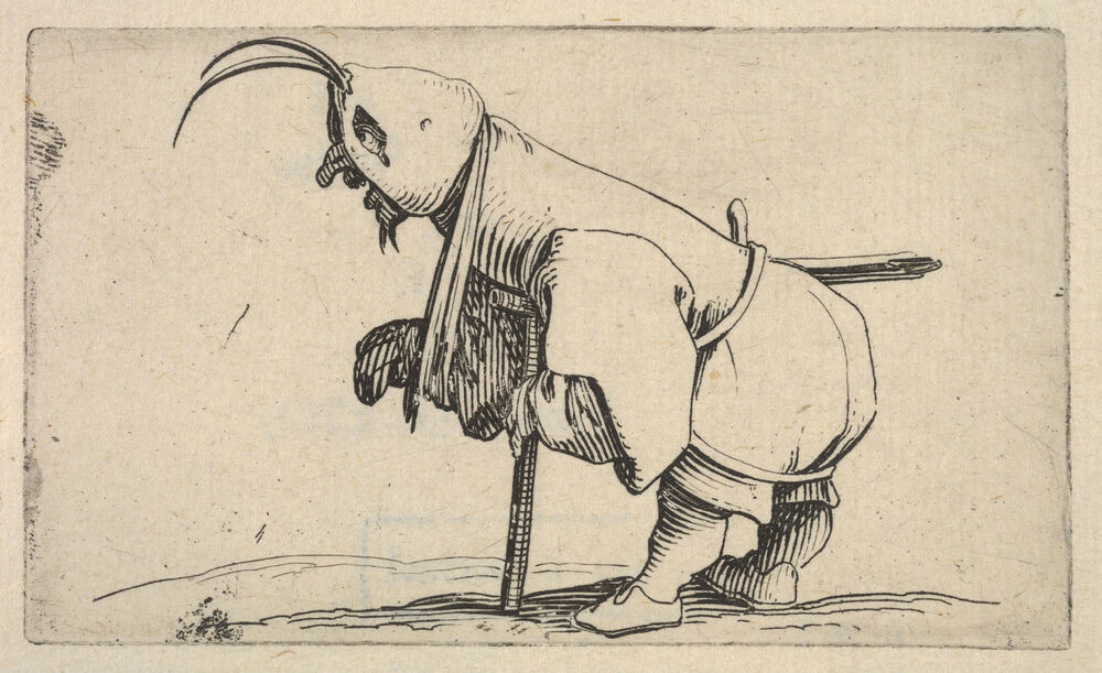 Hooded small figure hunched over a crutch, in profile view with left leg positioned forward and sword affixed to right hip, from the series 'Varie figure gobbi'