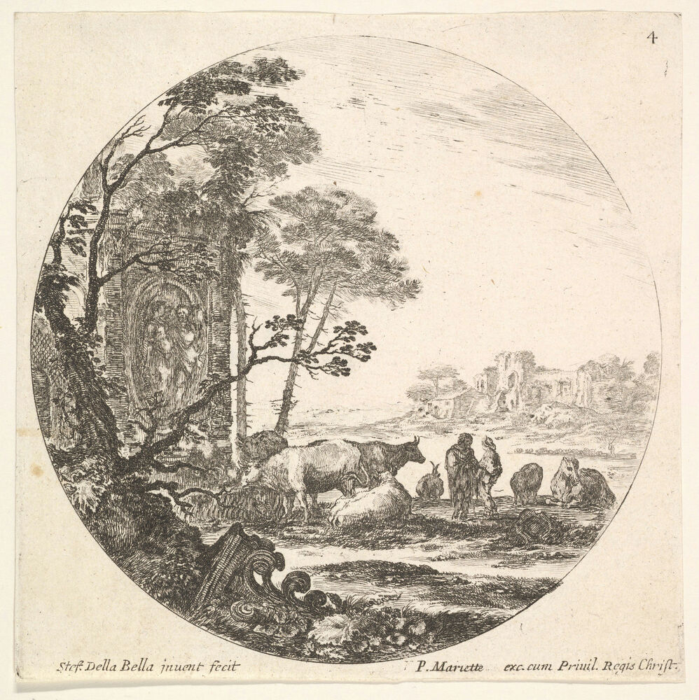 Plate 4: a Corinthian capital on the ground to left in the foreground, a monument with figures in low relief to left in the middleground, various animals and two shepherds to right, a round composition, from 'Roman landscapes and ruins' (Paysages et ruines de Rome)