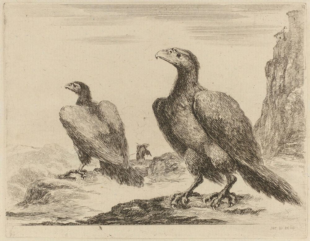 Two Eagles, Both with Heads Turned to the Left, On a High Cliff