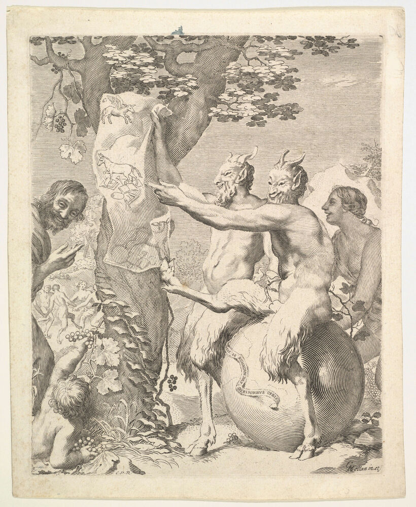 Two satyrs, traditionally known as the 'Mockers,' laughing and using their limbs to pin a drawing to a tree trunk, at left a smiling man points toward the drawing, at right is a laughing woman, a globe underneath one of the satyrs