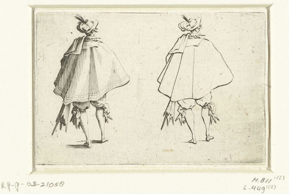 Tweemaal dezelfde man met mantel en zwaard, op de rug gezien