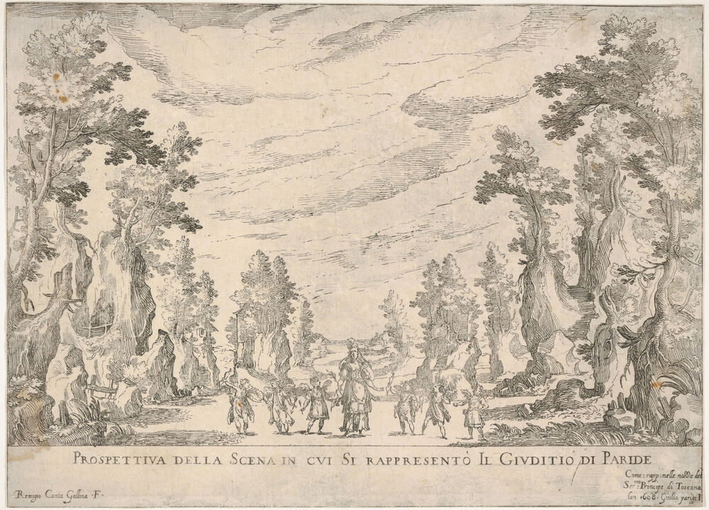 View of the scene in which is represented the Judgment of Paris (Prospettiva della scena in cui si rappresentò il Giuditio do Paride), from the series 'Seven Interludes' for the wedding celebration of Cosimo de' Medici in Florence, 1608