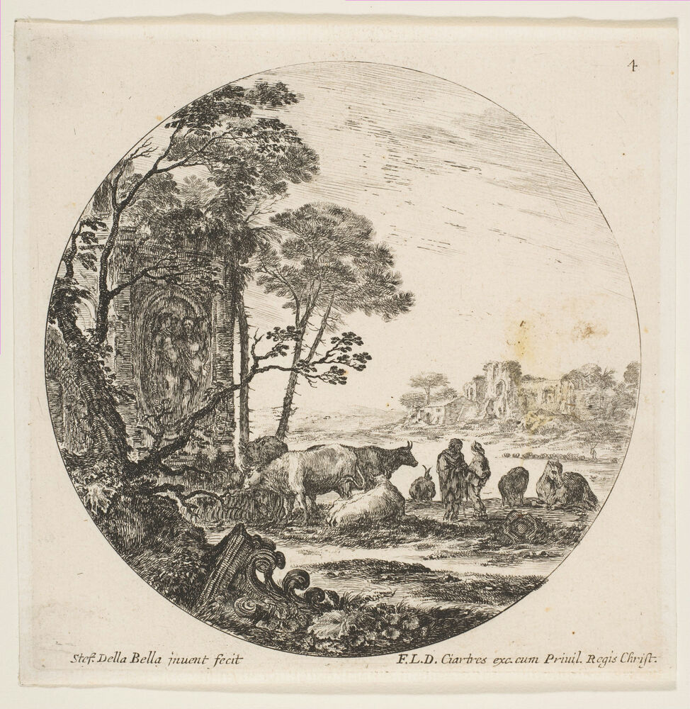 Plate 4: a Corinthian capital on the ground to left in the foreground, a monument with figures in low relief to left in the middleground, various animals and two shepherds to right, a round composition, from 'Roman landscapes and ruins' (Paysages et ruines de Rome)