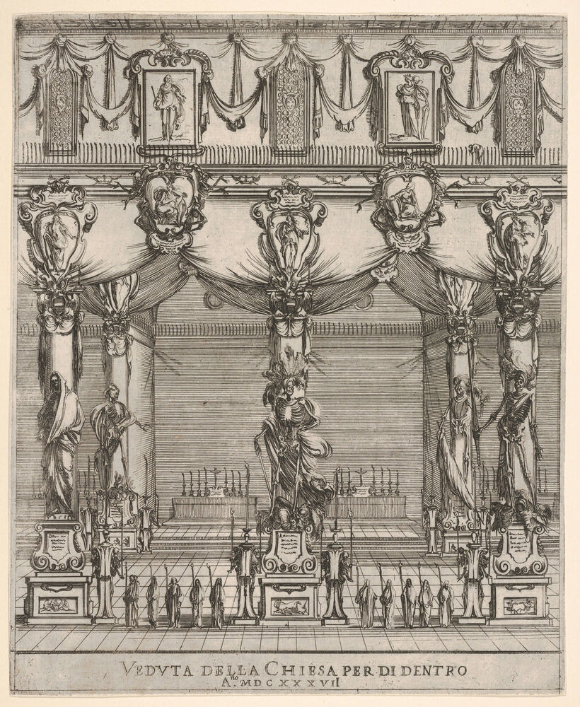 Interior of the church of San Lorenzo in Florence, five pillars, each with a large figure of death on a pedestal, ten hooded figures with staffs in foreground, two altars in the background, cartouches containing female figures above, from 'Ceremonies for the Funeral of Emperor Ferdinand II' (Funérailles de l'empereur Ferdinand II)