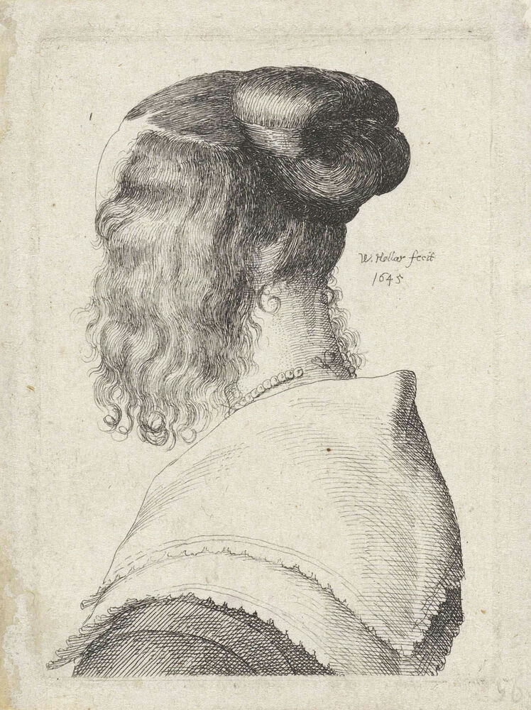 Vrouw met opgestoken haar, schuin op de rug gezien