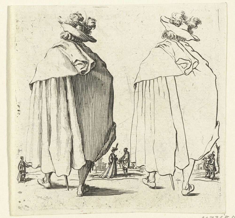 Tweemaal dezelfde soldaat met grote gepluimde hoed en mantel, op de rug gezien