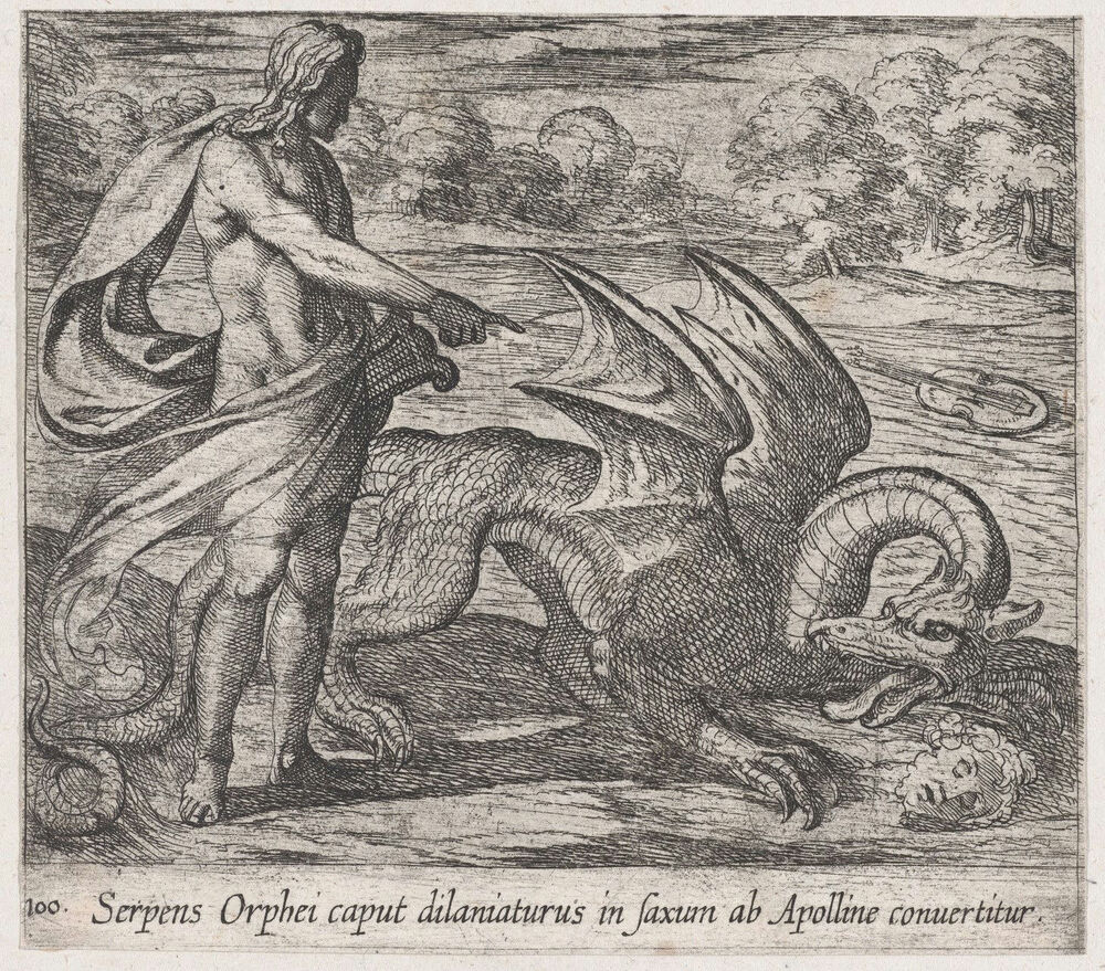 Plate 100: Apollo Killing the Serpent Attacking Opheus's Head (Serpens Orphei caput dilaniaturus in saxum ab Apolline convertitur), from Ovid's 'Metamorphoses'