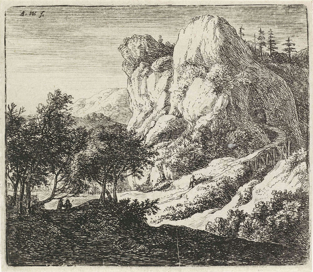 Houten brug bij een rotspartij