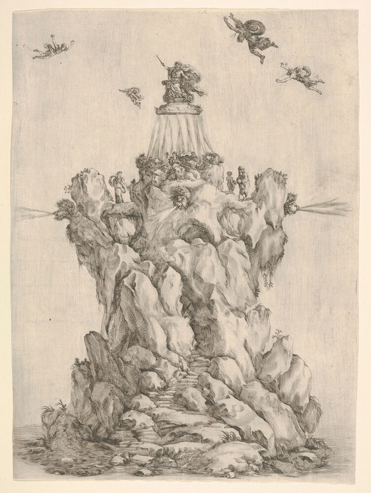 The rock of Aeolus, surrounded by water, with steps leading up the rock, the heads of three of the four winds on each corner blowing outwards, Aeolus crowned at the summit, four winds in the sky around him, from 'The contest of the seasons' (La gara delle stagioni)