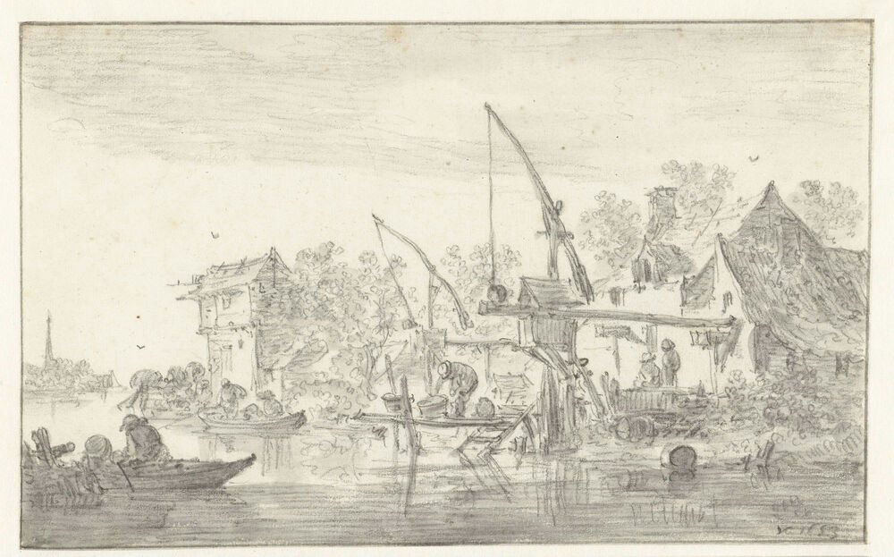 Riviergezicht met een aanlegsteiger met hefbomen