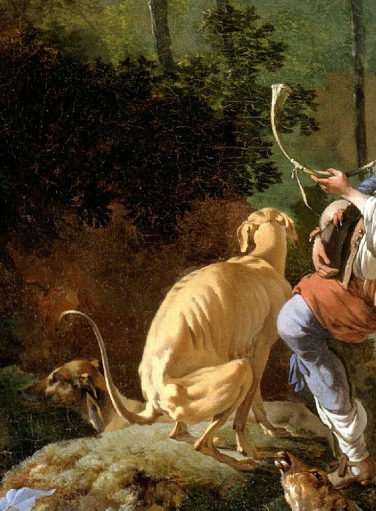 Adam Pynacker, 'Landscape with Sportsmen and Game' 1665, detail of dog