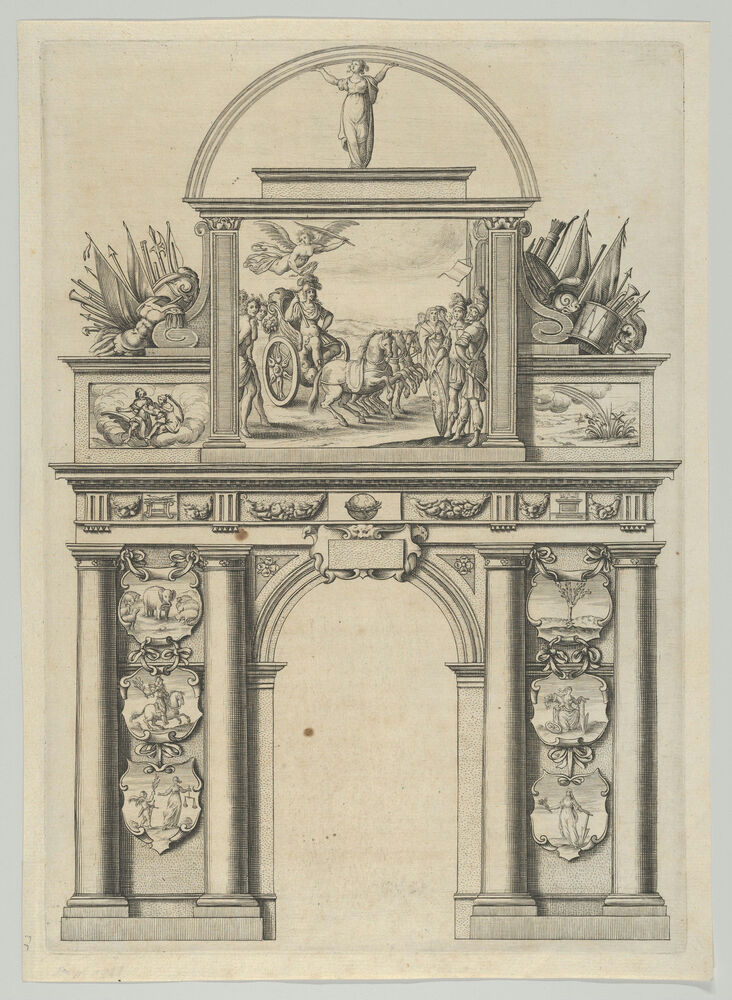 Triumphal arch, from 'Éloges et discours sur la triomphante réception du Roy en sa ville de Paris ...' by Jean-Baptiste de Machault