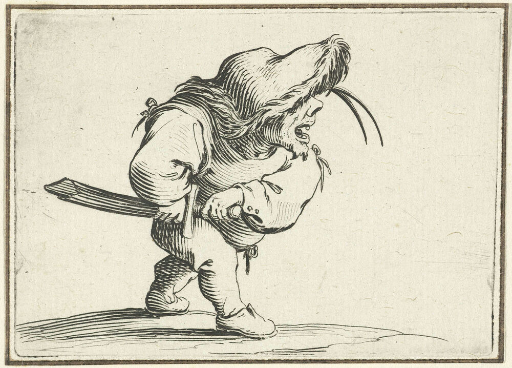 Kleine mens (karikatuur) met zwaard, in aanvallende houding