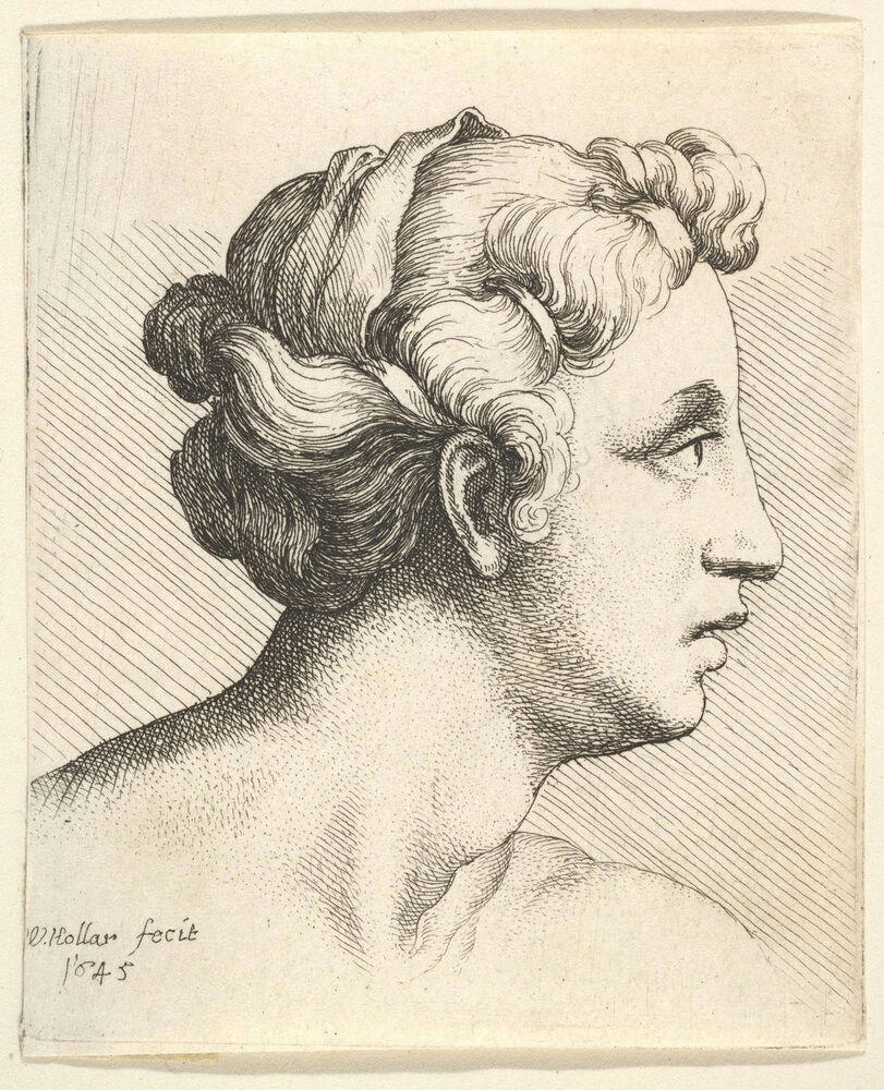Woman with a bound tress of hair in profile to right