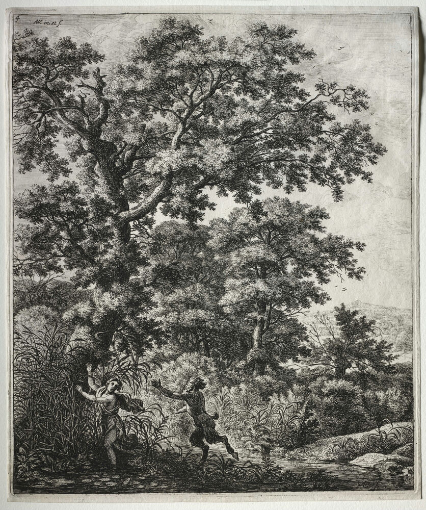 Six large upright landscapes with scenes from Ovid's Metamorphoses: Pan and Syrinx