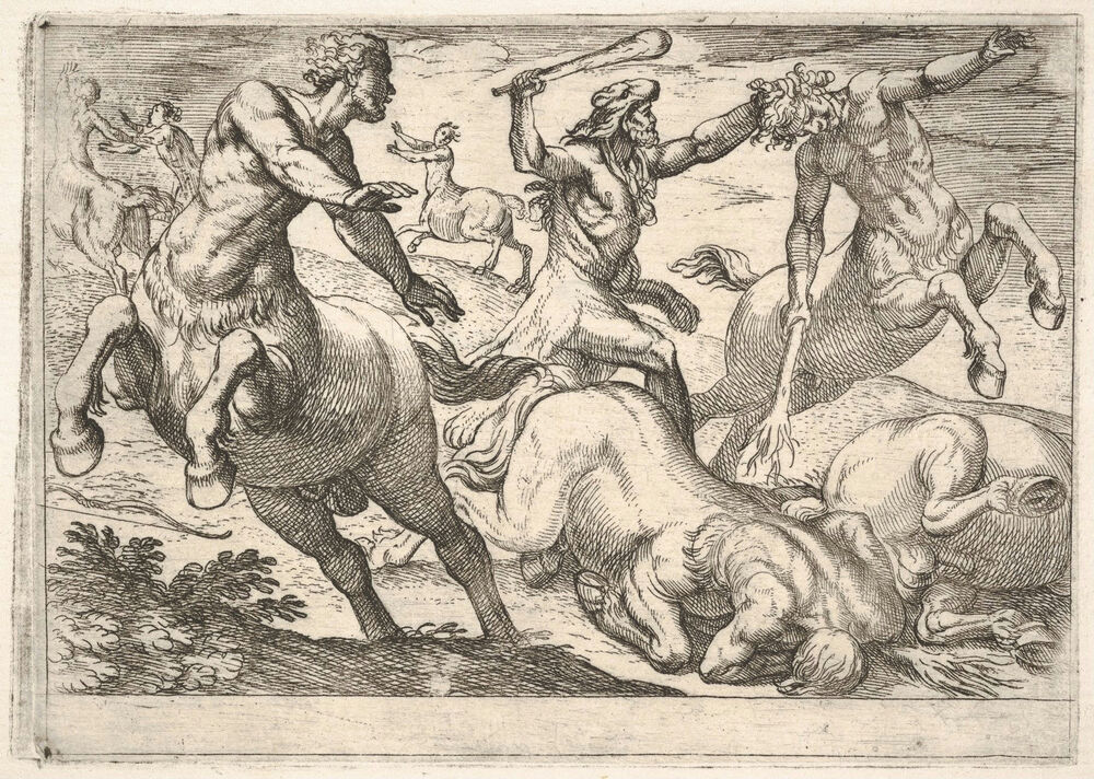 Hercules and the Centaurs: Hercules holds the head of a centaur with his left hand and raises his club with his right hand, in the foreground and background are fallen and fleeing centaurs, from the series 'The Labors of Hercules'