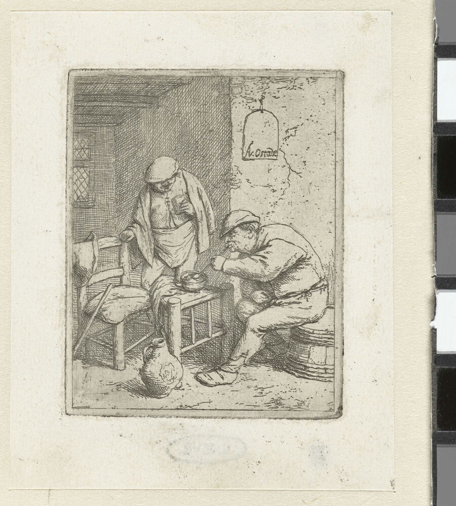 Interieur van een herberg met man die pijp aansteekt en man met glas in zijn hand