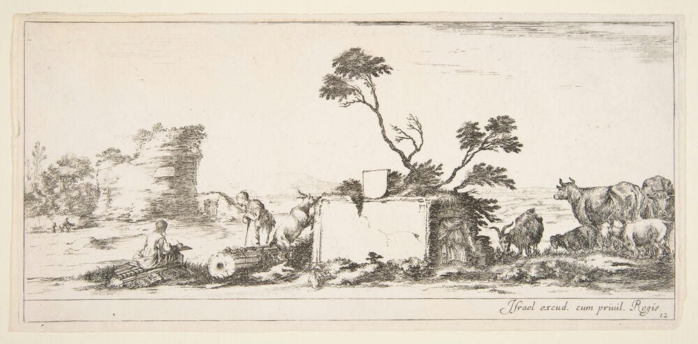 Plate 12: a seated draughtsman to left, a standing shepherd next to him to right, ruins and animals to the right, a tower in ruins to left in the background, from 'Various landscapes' (Divers paysages)