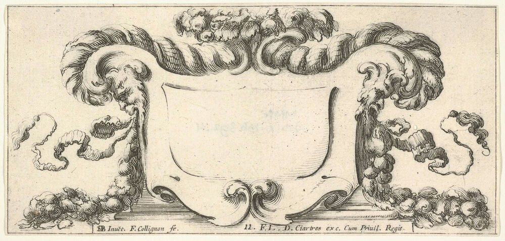 Plate 11: a cartouche with fruits, flowers, and leaves at top, a mask of a faun in profile to either side with a festoon of fruits and flowers in each of their mouths, from 'Twelve cartouches' (Recueil de douze cartouches)