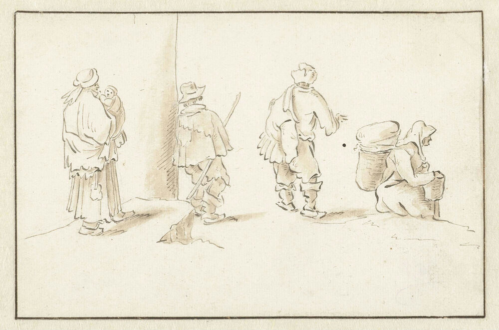 Moeder met kind, twee mannen en een marktvrouw