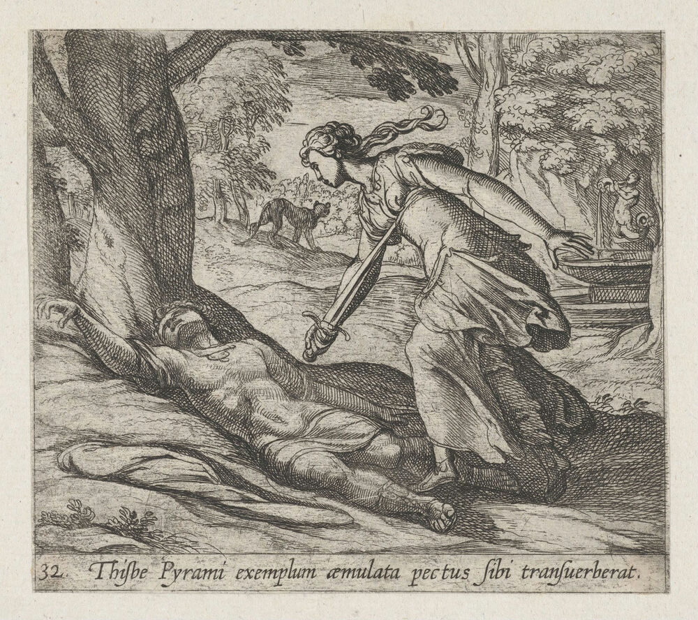 Plate 32: Thisbe Killing Herself (Thisbe Pyrami exemplum aemulata pectus sibi trasuerberat), from Ovid's 'Metamorphoses'