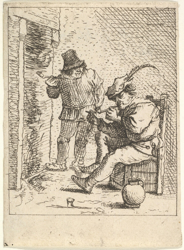 Two male peasants holding pipes before a fireplace, one seated with the pipe held to his mouth, to his left the other stands with the pipe in his right hand, after a series of four prints of peasants by David Teniers the Younger