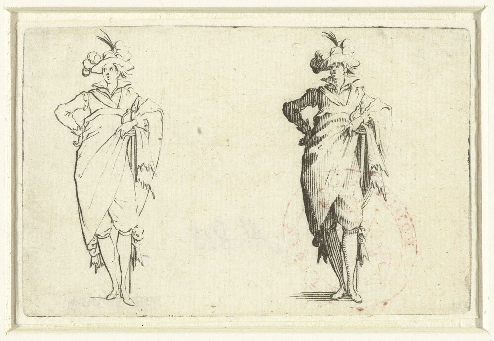 Tweemaal dezelfde man met mantel en zwaard, de rechterhand in de zij, van voren gezien