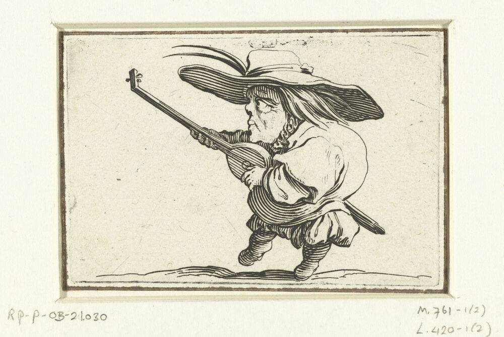 Kleine mens (karikatuur) met luit en zwaard