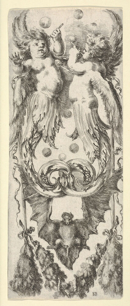 Two putti above, their legs ending in scrollwork, a bat below, from 'Ornaments or Grotesques' (Ornamenti o Grottesche)