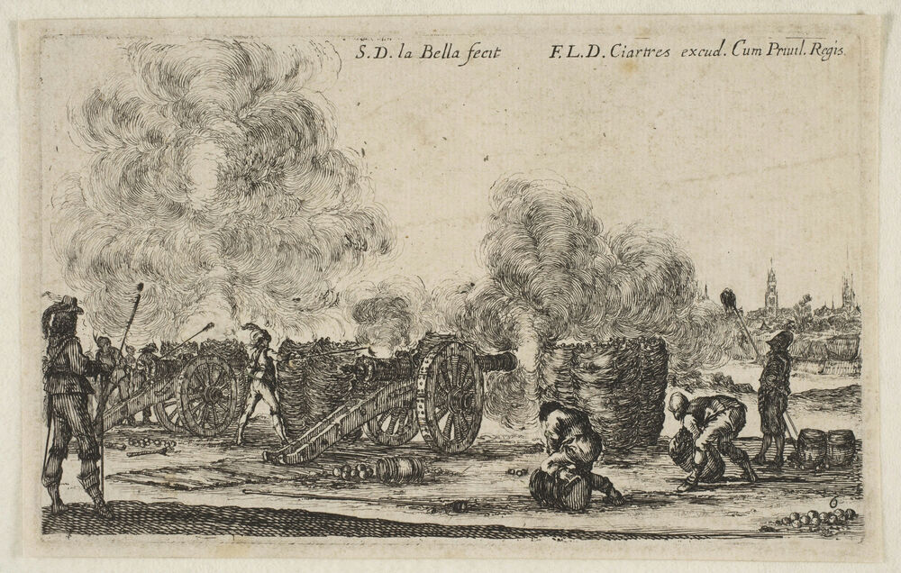 Plate 6: battery of cannons firing on a city, from 'Various Military Caprices' (Varii capricci militari)