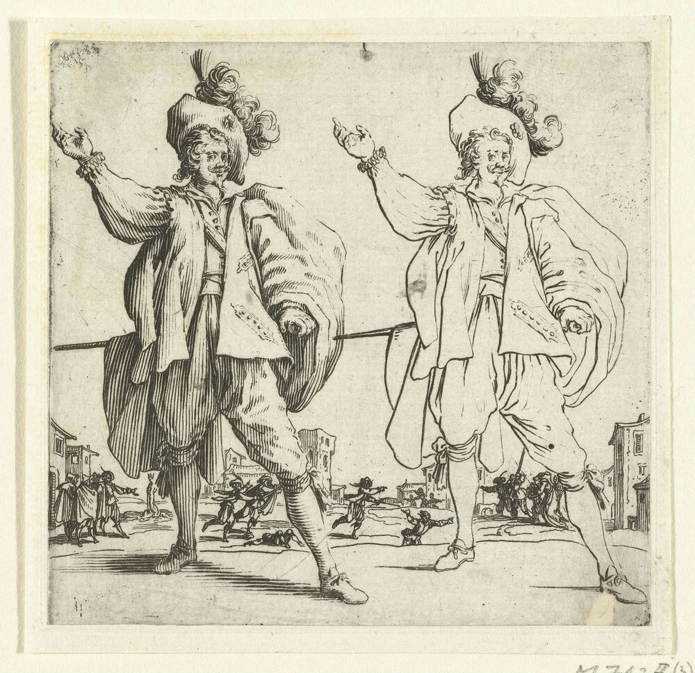 Tweemaal dezelfde soldaat met grote gepluimde hoed en opgeheven arm, van voren gezien