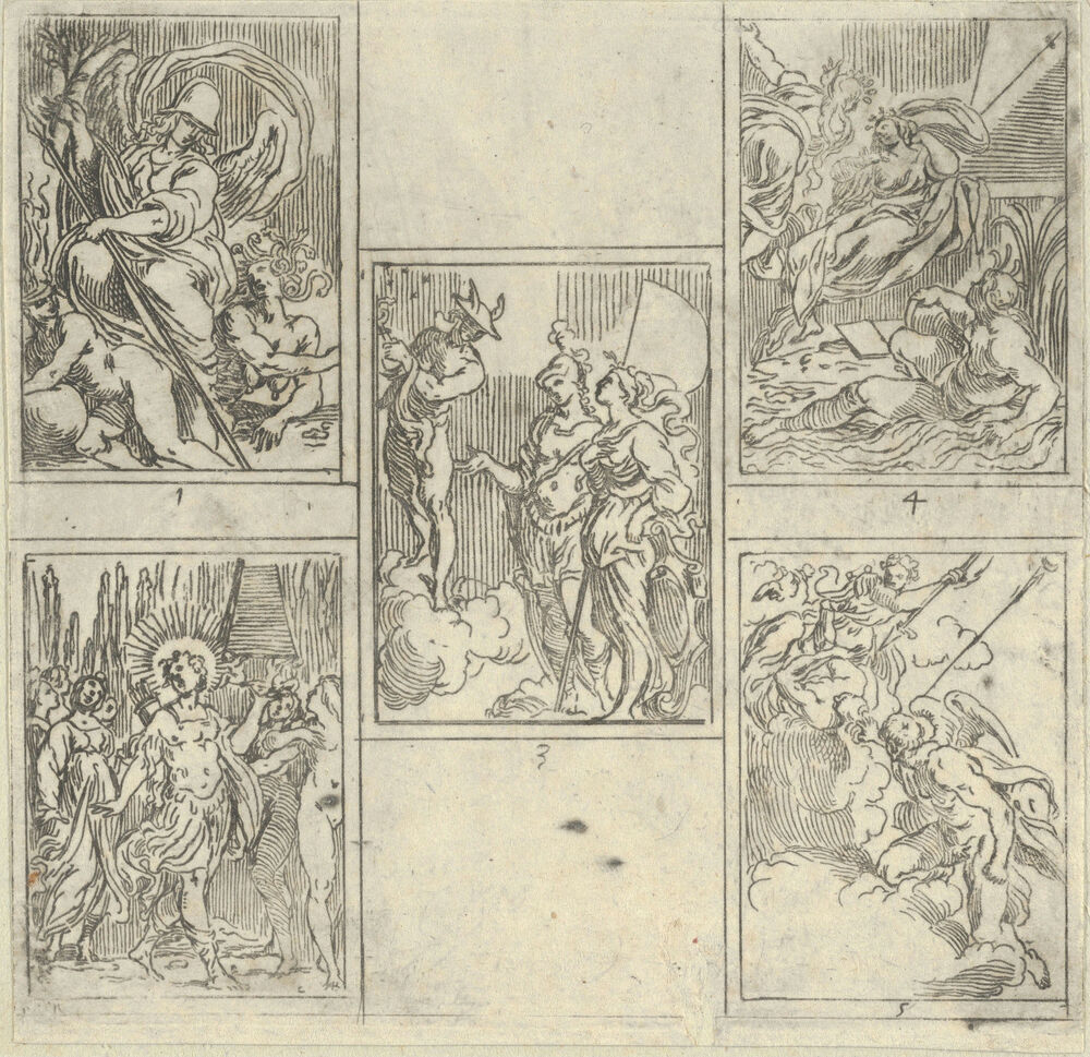 Five numbered scenes, each after a painter in the Accademia Degl'Incamminati, from IL FUNERALE D'AGOSTINO CARRACCIO FATTO IN BOLOGNA SUA PATRIA DAGL'INCAMINATI Academici del Disegno: 1. Virtue vanquishing Envy and Fortune, painted by Giulio Cesare Parigino; 2. Apollo and the Muses at the tomb of Agostino Carracci, painted by Luigi Valesio; 3. Mercury pointing to a constellation with the personification of Painting and that of the city of Bologna, Felsina, painted by Aurelio Benelli; 4. Personification of Painting being comforted by Poetry, and the personification of a river at right, painted by Lodovico Carracci; 5. Allegory of Knowledge and Vigilance chasing Envy out of Heaven, painted by Lorenzo Garbieri.