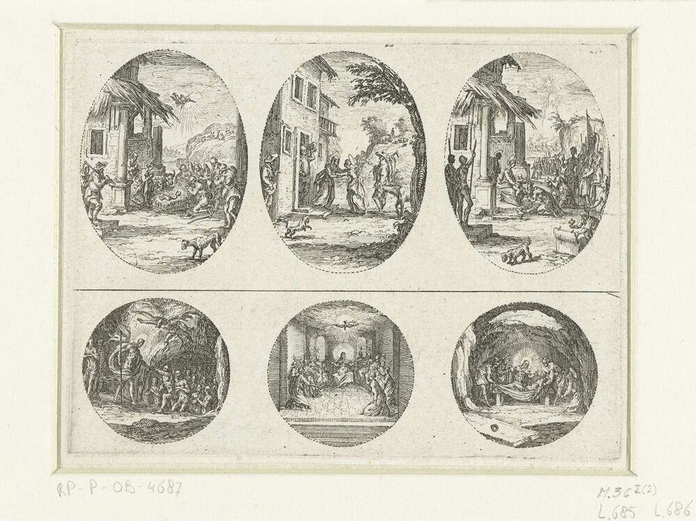 Drie scènes uit het leven van Maria en drie Passiescènes: Aanbidding door de herders, Visitatie, Aanbidding door de koningen, Afdaling in het voorgeborchte, Pinksteren, Graflegging