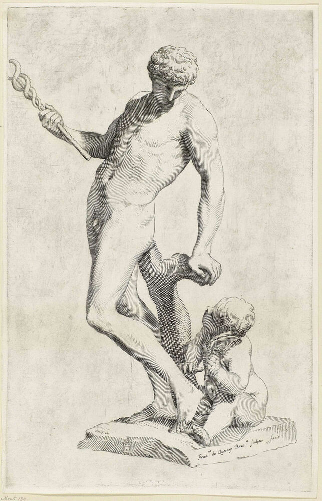 Standbeeld van Mercurius met een putto aan zijn voeten