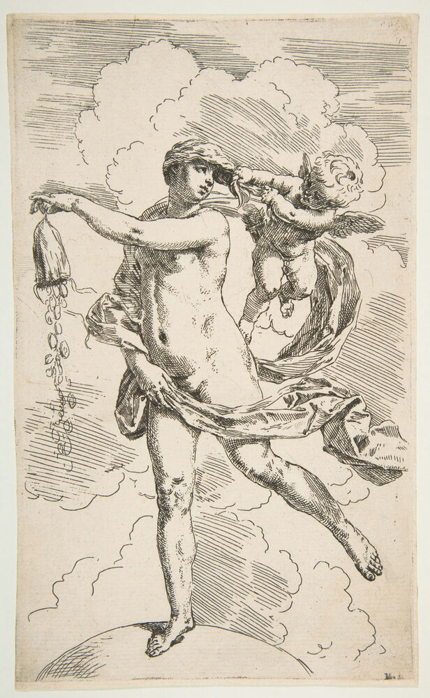 Fortune standing with one foot on a globe and emptying a purse of coins