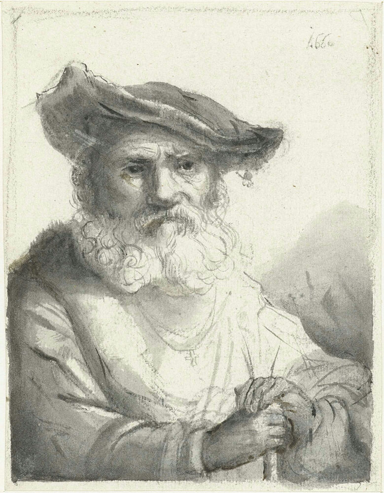 Kop van een oude, bebaarde man met een fluwelen baret