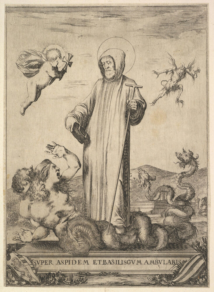 Saint Jean Gualbert trampling a monster with two human heads and a serpentine body, a flying demon in background to right, an angel with a cross flying to left, from 'Frontispiece and four scenes from the life of Saint John Gualbert' (Frontispice et quatre vignettes pour une vie de Saint Jean Gualbert)