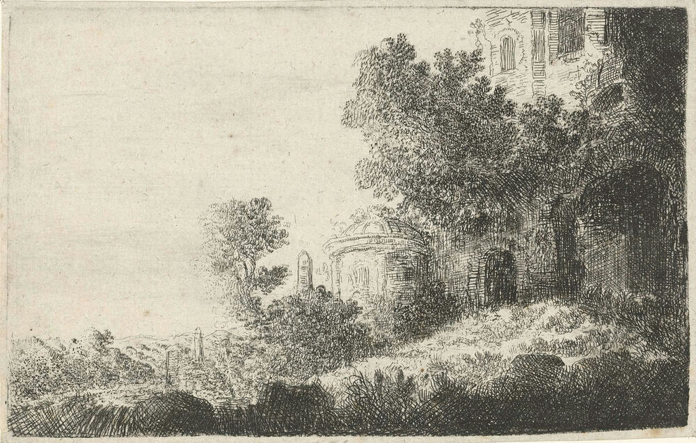 Landschap met rechts gebouwen tussen bomen