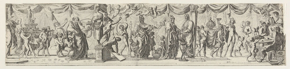 Frieze-like composition of figures walking alongside draped curtains: at left satyrs and children bear a statue of Bacchus on a litter behind an old man (Silenus?), at center two robed satyrs approach a priest, at right Apollo lifts a cup next to satyrs seated at a round table