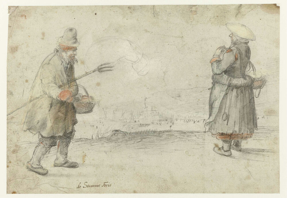 Studies of a Man and a Woman Standing on the Bank of a Frozen River, with a Town in the Distance