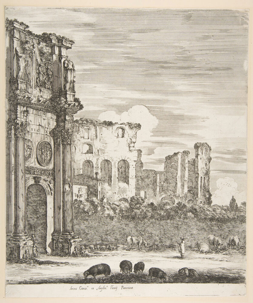 Arch of Constantine and Colosseum with sheep grazing in foreground, from 'Six large views, four of Rome, and two of the Roman countryside' (Six grandes vues, dont quatre de Rome et deux de la Campagne romaine)