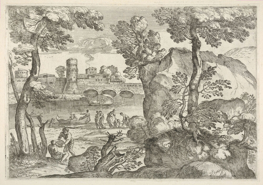 Landscape with bridge traversing a river occupied with three small boats, one of which is encroaching the near river bank, in the foreground are a rocky outcrop and a figure lifting a circular dish above a seated figure