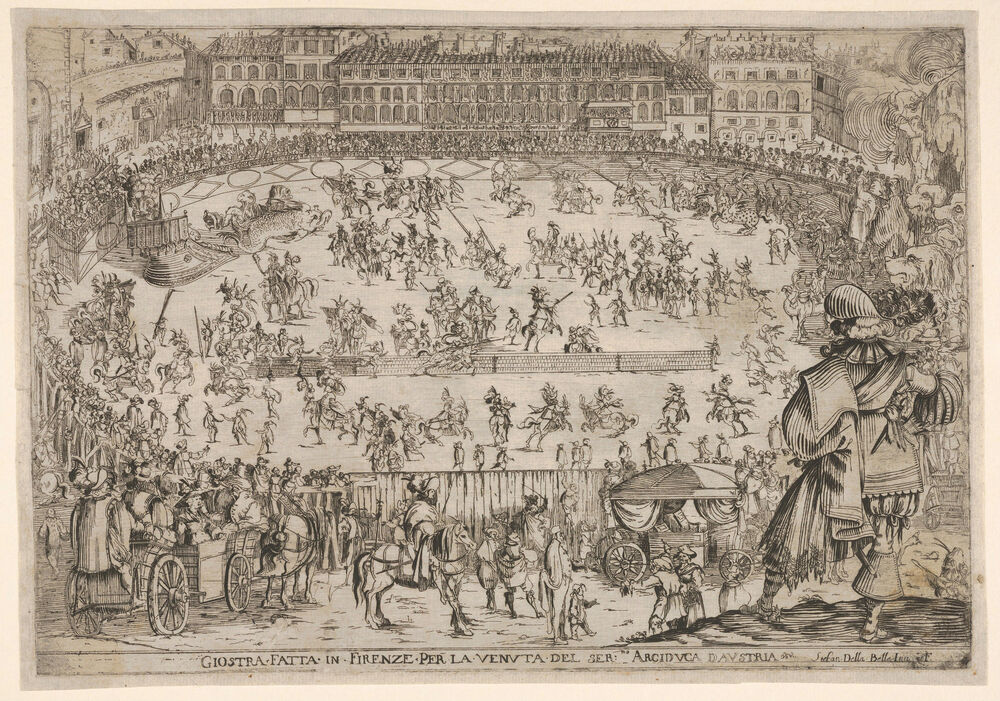 Joust held in Florence for the arrival of the archduke of Austria, an oval arena with many horsemen and pedestrians, spectators in carriages in the foreground, a row of houses at center in the background, from 'Combattimento e balletto a cavallo'