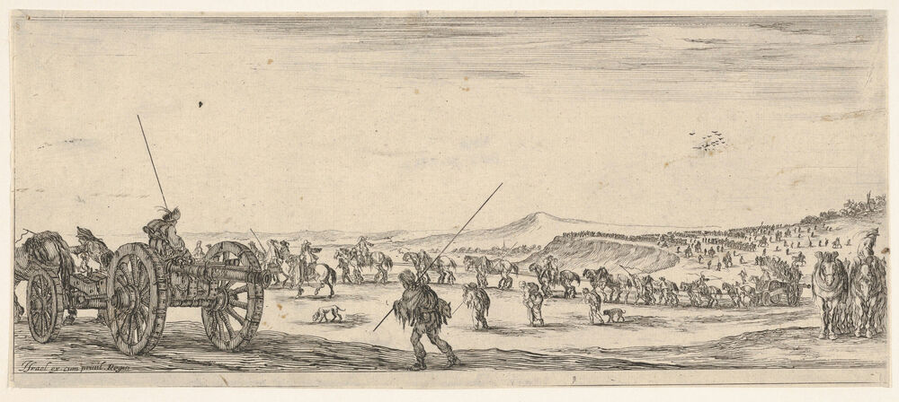 A procession of horsemen and cannons in the middle ground walking to the left, a cannon and two men to left, from 'Peace and War' (Divers desseins tant pour la paix que pour la guerre)