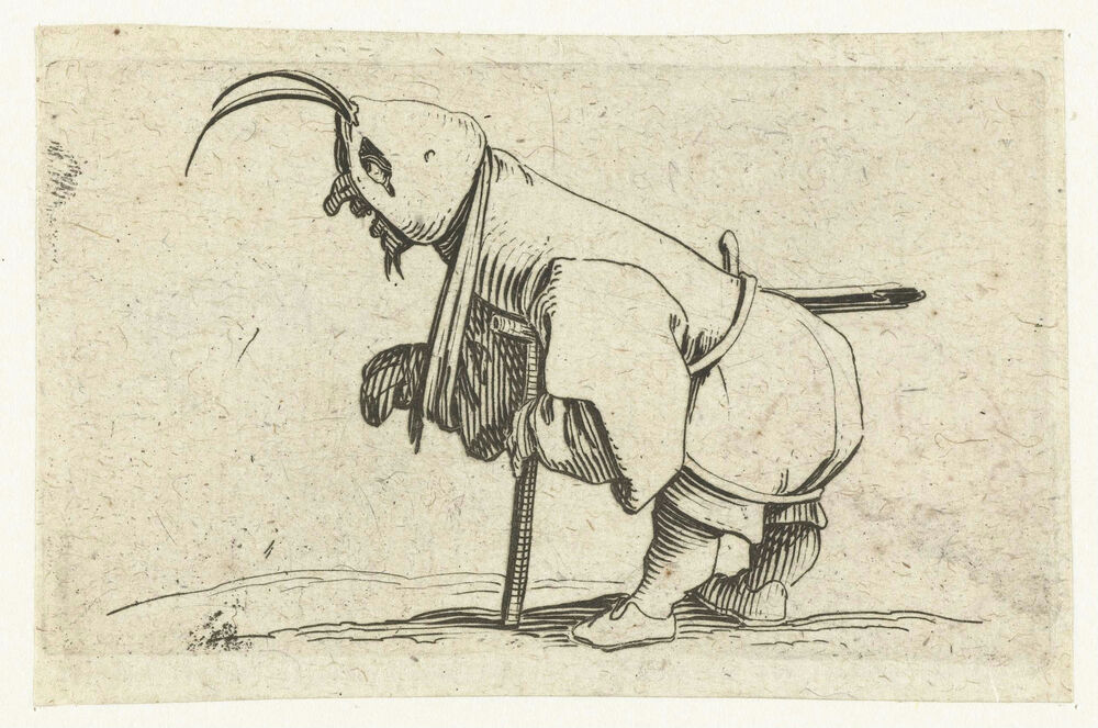 Kleine mens (karikatuur) met mitella, kruk en zwaard