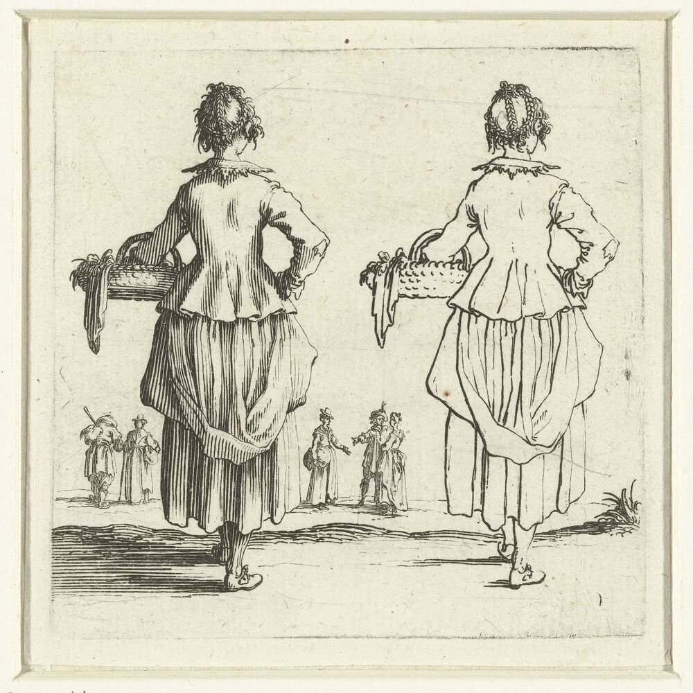 Tweemaal dezelfde boerin met rieten mand, op de rug gezien