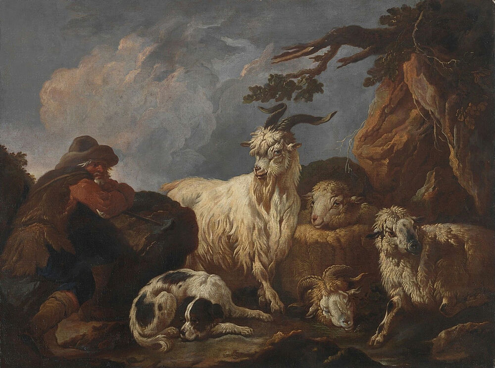Pastýř se psem, kozlem, kozou a dvěma ovcemi