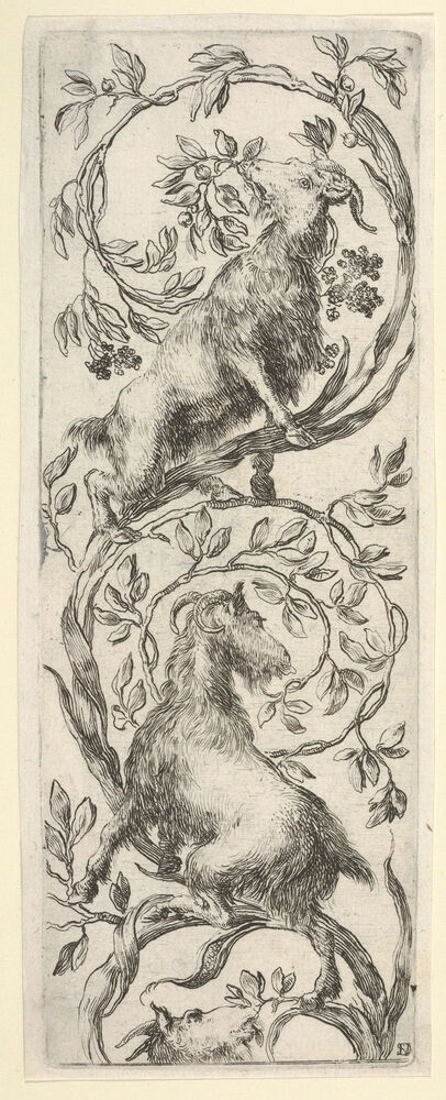 Three goats climbing a vine in the shape of a backwards 'S', from 'Ornaments or Grotesques' (Ornamenti o Grottesche)