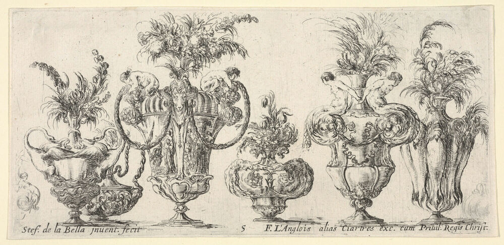 Six vases, and two sketches of vases on the extremities, Plate 5 from: 'Collection of Various Vases' (Raccolta di Vasi Diversi)